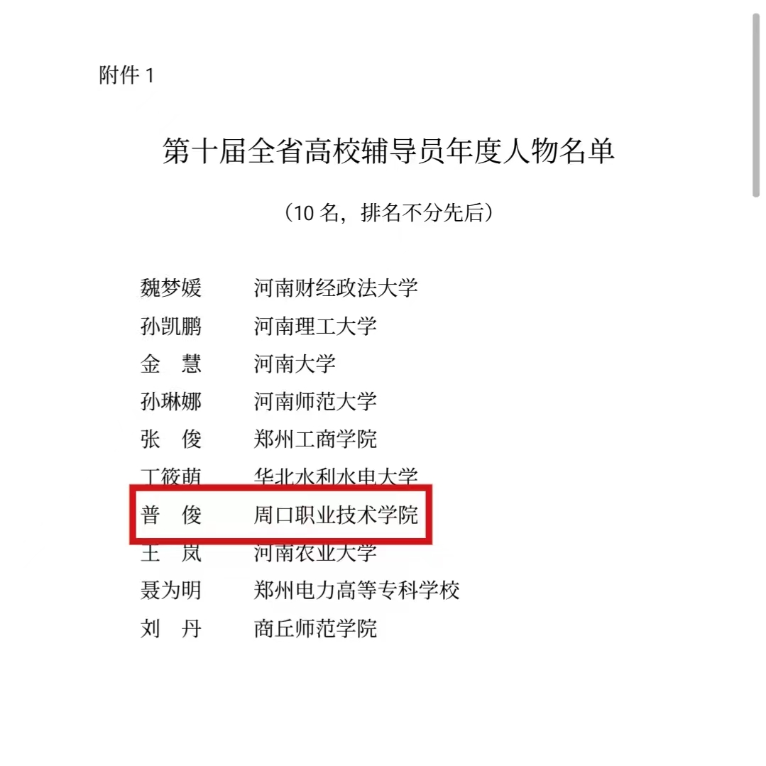 日前,由中共河南省委教育工委河南省教育厅组织开展的“第十届全省高校辅导员年度人物”评选活动揭晓,beat365官网普俊老师荣获“第十届全省高校辅导员年度人物”称号,这是我校参加该项评选活动获得的最高荣誉,也是周口市高校唯一获此殊荣的辅导员。