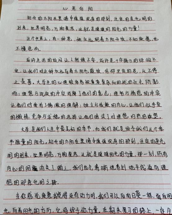 在班级统一向全体同学组织了“心理征文”的活动,围绕“心光”主题,鼓励学生结合自身经历,阐述对心理健康的理解、在生活中遇到的挑战及自我成长的心路历程。无论是讲述克服困难的故事,还是对日常心理状态的思考,都在征文范围之内。