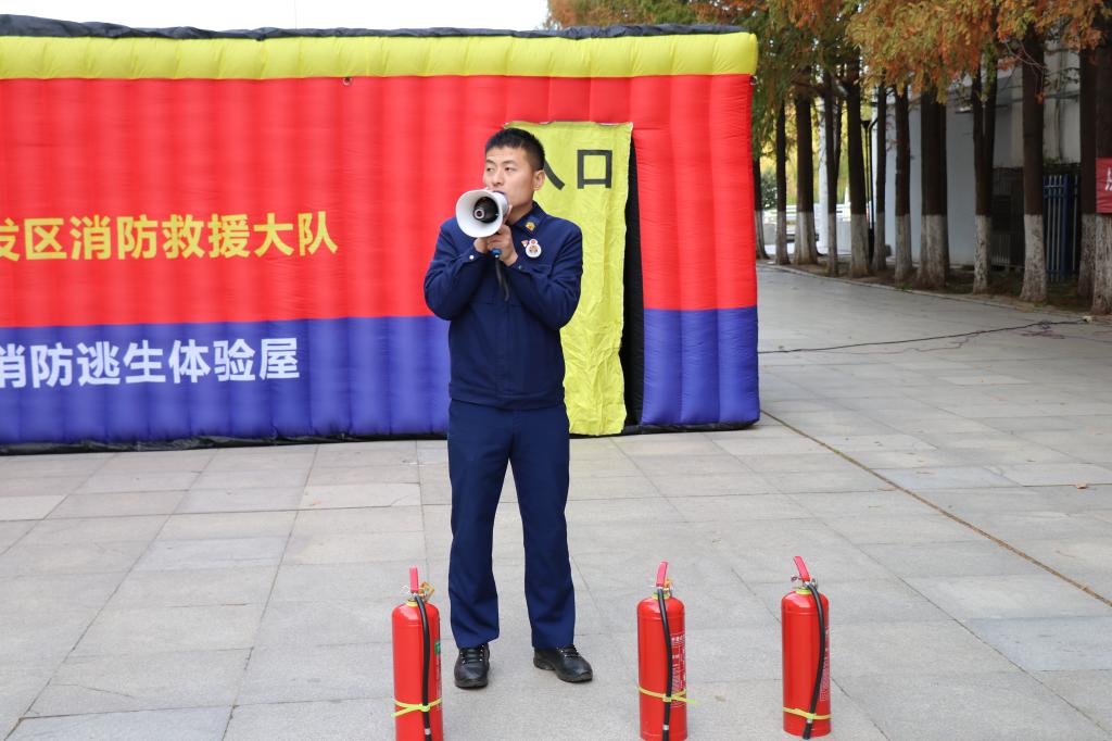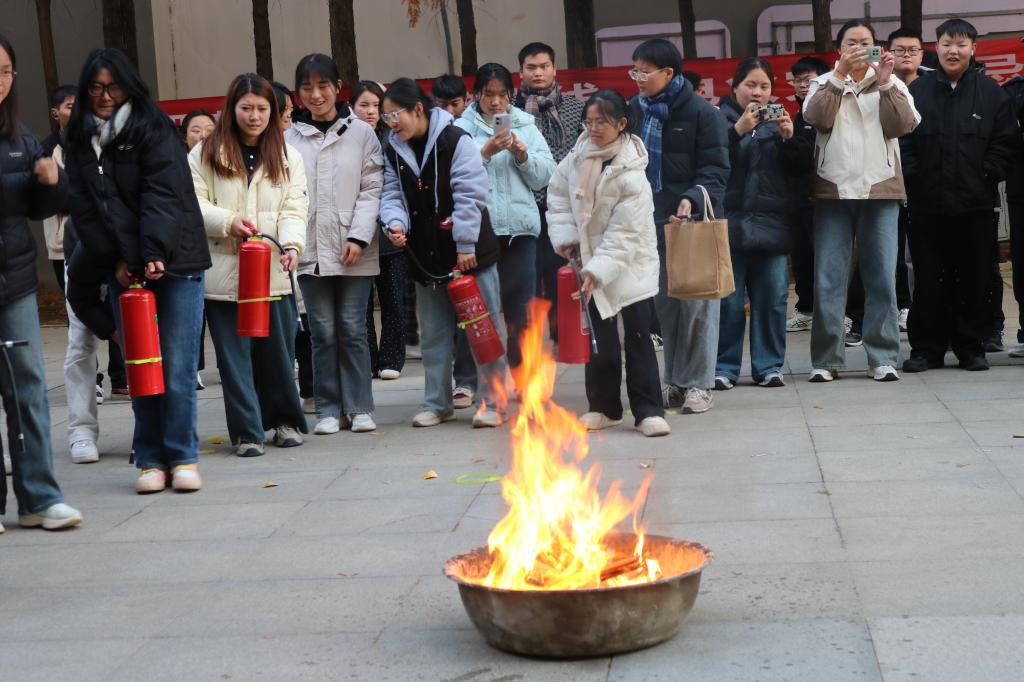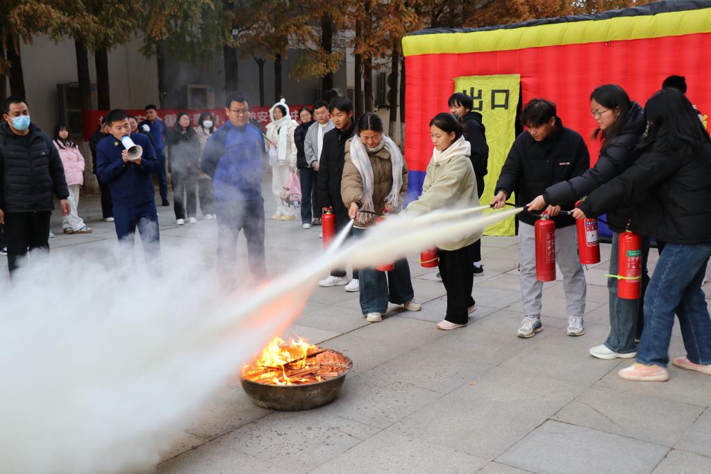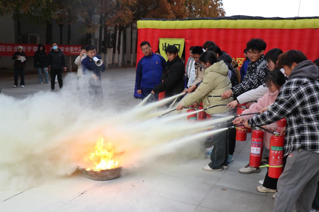 随后,周口市消防支队带领同学们正确使用消防栓,模拟灭火和疏散演练。演练过程中同学们积极参与,认真听取负责人的指导,并按照正确的步骤使用灭火器进行灭火操作。同时,在模拟火灾疏散环节,同学们也能够迅速、有序地撤离到安全区域。整个演练过程紧张而有序,达到了预期的效果。