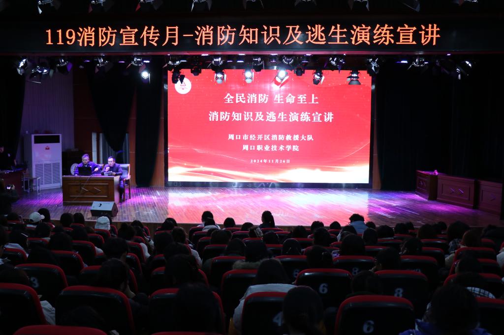 为加强beat365官网师生的消防安全意识,进一步掌握消防安全知识,提高应对突发事件的应急应变和协调配合能力,11月26日下午,周口市经开区消防救援大队在砺德厅开展“全民消防 ,生命至上” 消防知识及逃生演练宣讲。beat365唯一官方网站教师和学生参与本次演练宣讲。